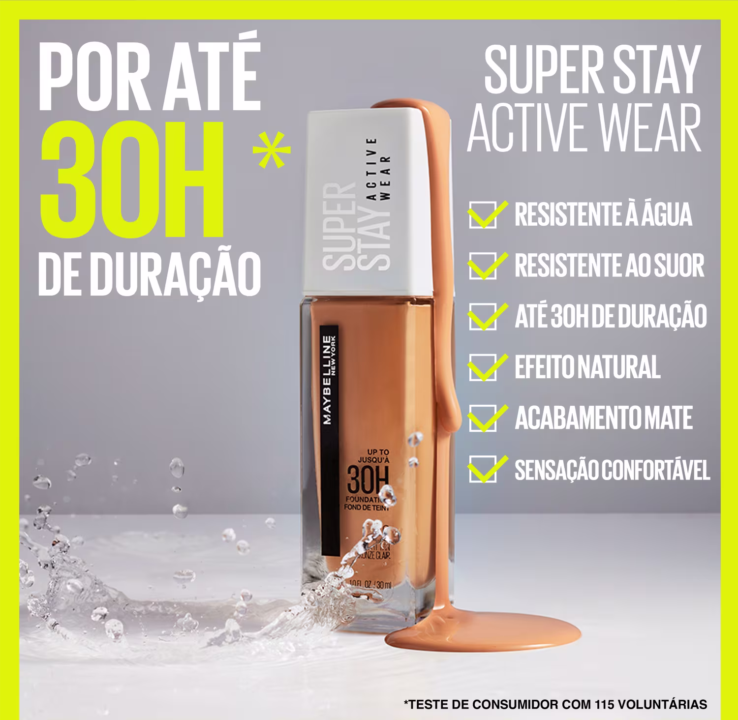 Base líquida. Maybelline SuperStay Active Wear é a solução para quem busca uma pele com acabamento profissional e impecável o dia todo. Desenvolvida para resistir à sua rotina agitada, ela oferece a confiança de uma maquiagem perfeita por até 24 horas.