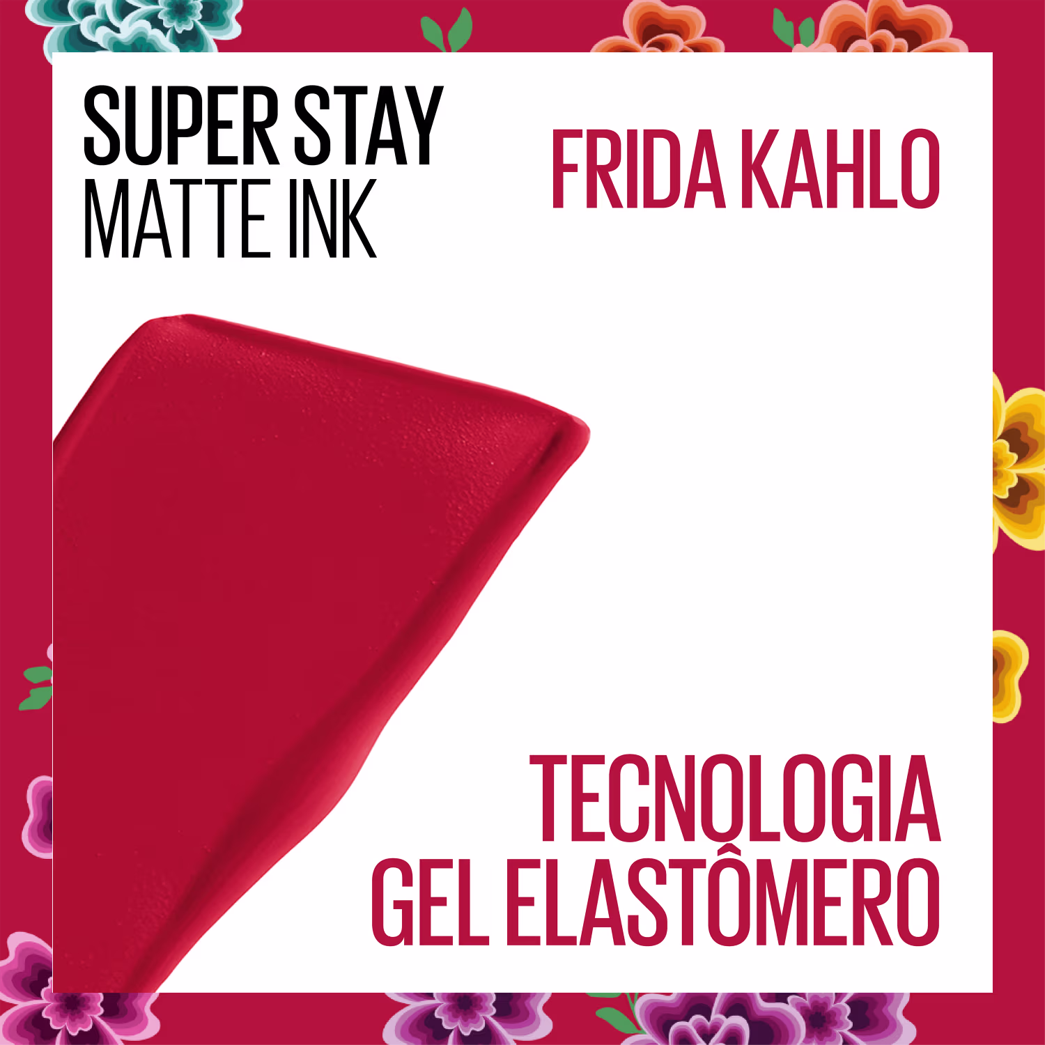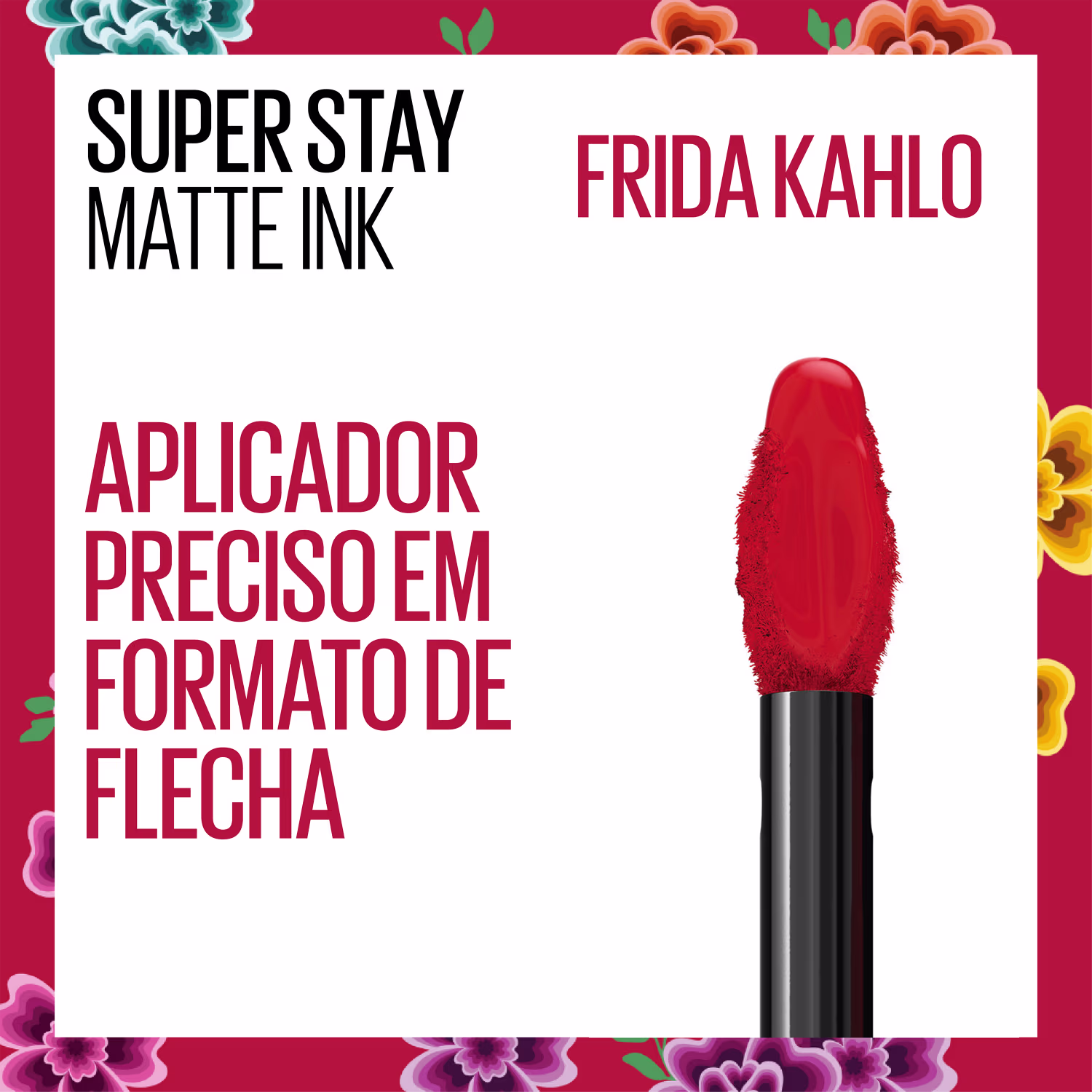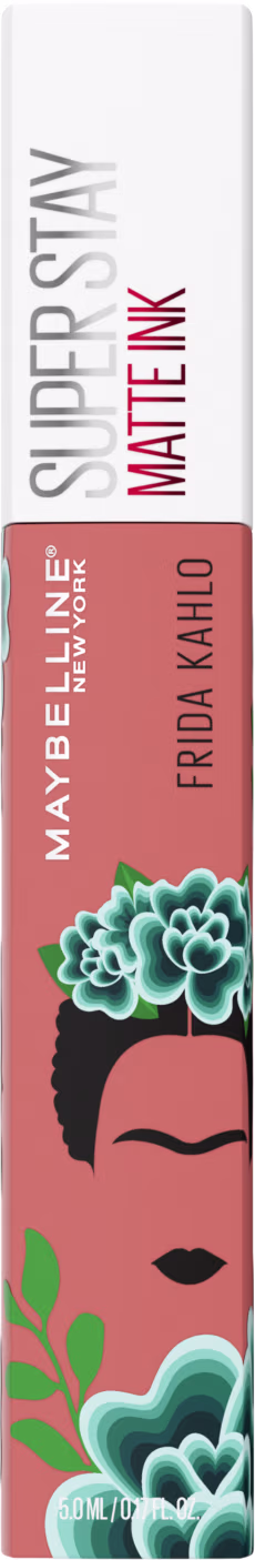 Batom Líquido Maybelline Superstay Matte Ink Frida Kahlo está disponível em cinco cores inspiradas no empoderamento, criatividade e arte de Frida Kahlo. O aplicador é em formato de flecha, representando uma aplicação precisa e certeira nos lábios. Superstay Matte Ink conta com a tecnologia gel elastômero, que oferece um conforto a mais na aplicação do batom líquido nos lábios.