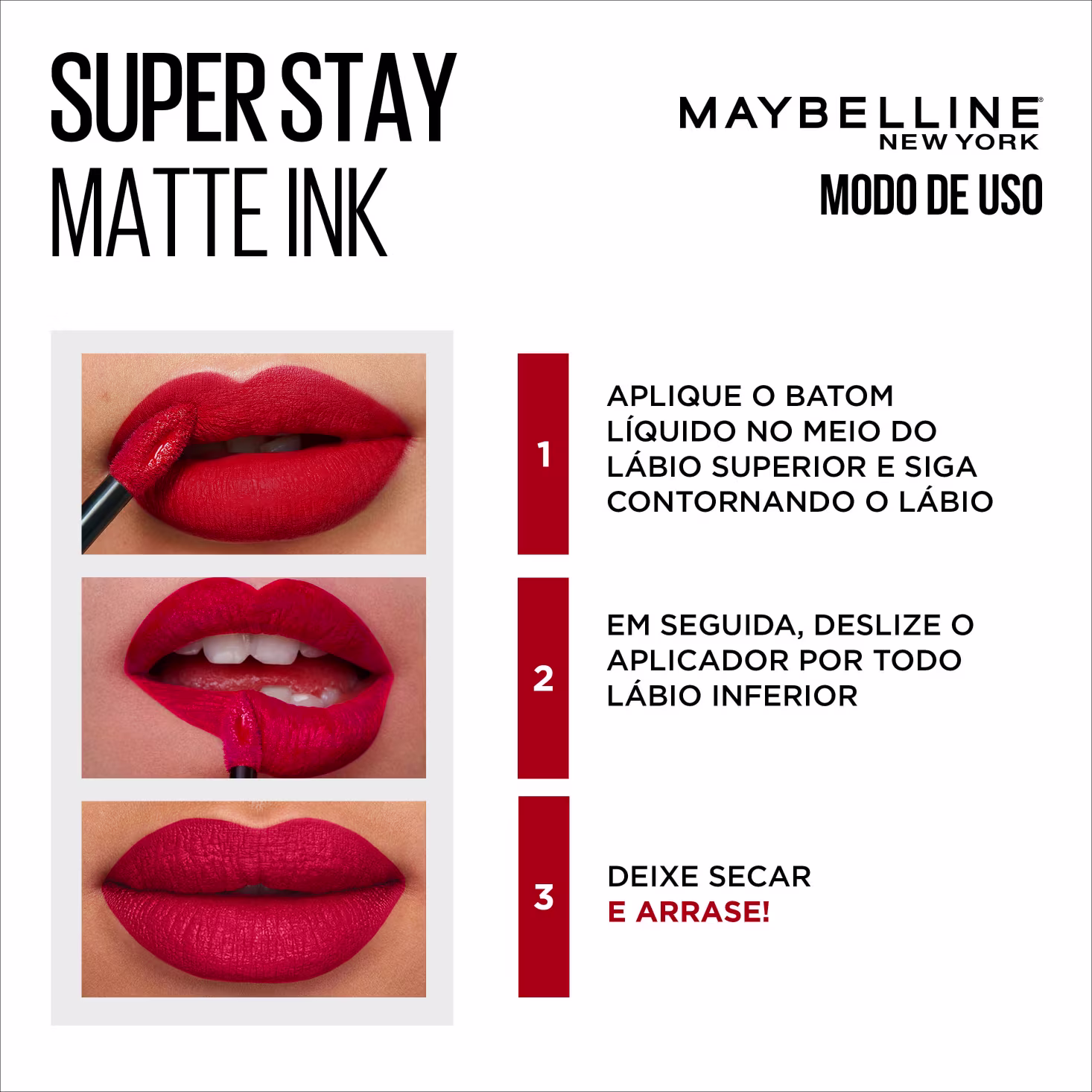 Batom líquido com acabamento matte. Maybelline Superstay Matte Ink é a sua declaração de estilo e promessa de durabilidade. Com um acabamento matte impecável e cores super pigmentadas, este batom é o aliado perfeito para quem busca uma maquiagem marcante que dura o dia todo.