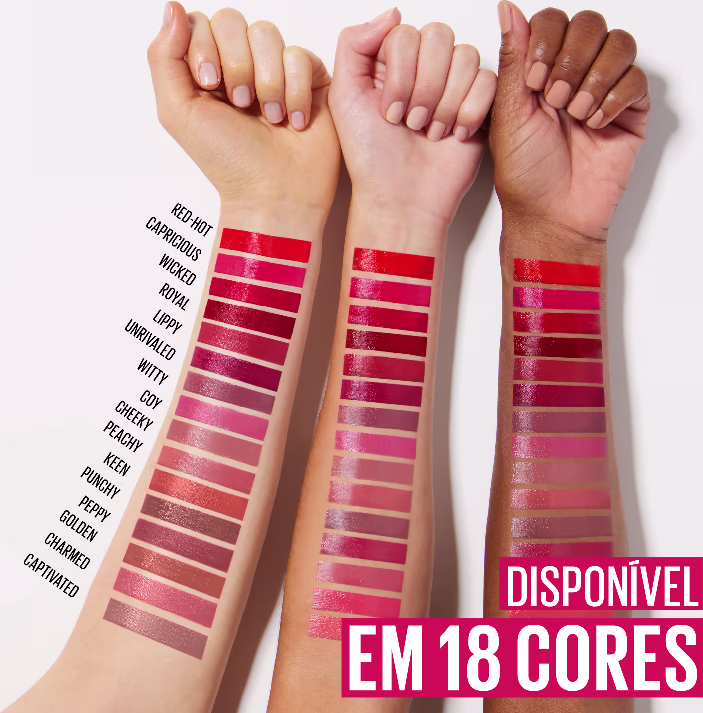 O Batom Líquido SuperStay Vinyl Ink de Maybelline NY traz tecnologia inovadora garante que a cor não resseque ou craquele, proporcionando conforto contínuo. A textura leve desliza suavemente, entregando uma cobertura uniforme que se transforma em um sofisticado acabamento espelhado. O resultado são lábios perfeitamente definidos, com um brilho luminoso que se mantém impecável ao longo do dia, ideal para quem busca um visual de alta performance sem abrir mão do conforto. (*Teste com 109 consumidoras).