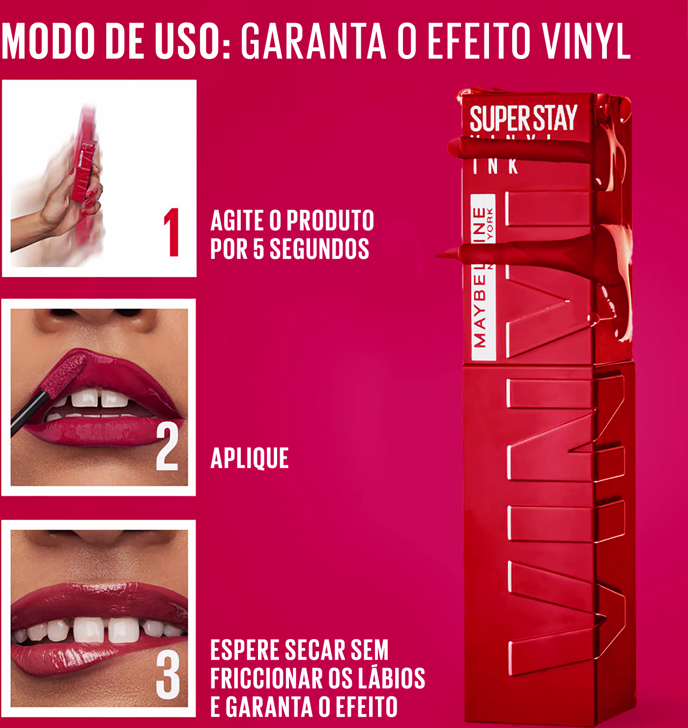 Batom líquido com efeito vinil. Maybelline NY SuperStay Vinyl Ink oferece um acabamento espelhado de alta performance e longa duração. Conquiste lábios com brilho instantâneo e cor vibrante que realçam sua beleza com um toque de sofisticação. Com uma fórmula exclusiva à prova de manchas e pigmentos de alta fixação, este batom líquido permanece intacto por até 16 horas*, eliminando a necessidade de múltiplos retoques.