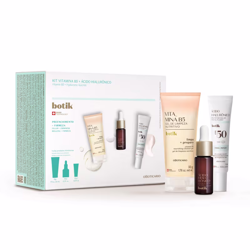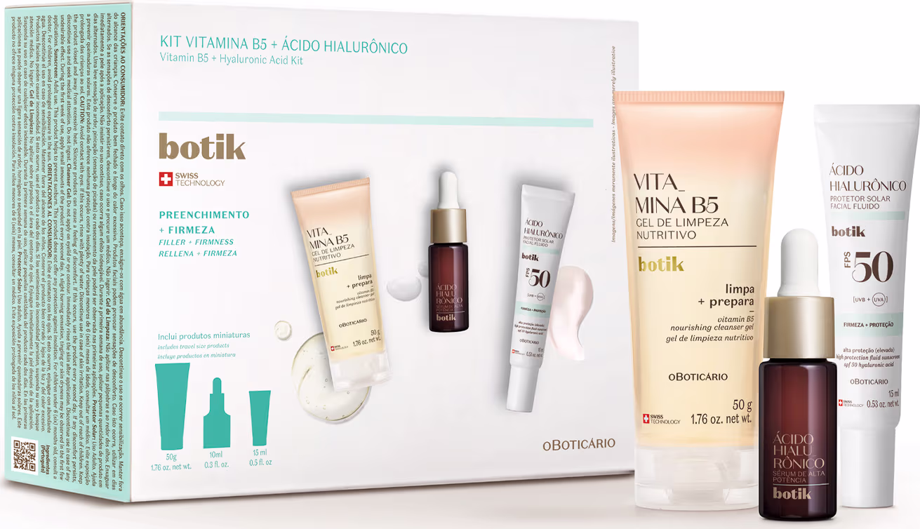 Não sei o CEPO Mini kit Botik Ácido Hialurônico entrega três itens em miniatura para as etapas importantes da sua rotina diária de skincare: o sérum facial, com seu poder de tratamento e cuidado, e o protetor solar, a última e essencial etapa do cuidado para a pele. Com Ácido Hialurônico e Vitamina B5, em um passo a passo para uma pele mais firme e com rugas e linhas de expressão preenchidas: