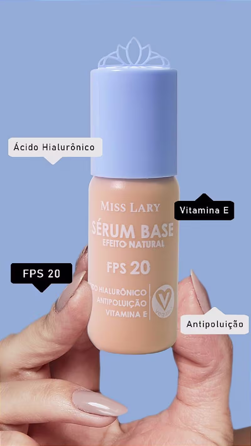 Sérum Base Miss Lary Efeito Natural FPS 20 30 para pele com cobertura uniforme e linhas de expressão reduzidas. Melhores Bases Miss Lary na BLZ. Ver mais ❯