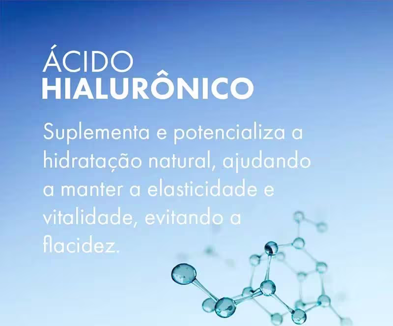 - Ácido Hialurônico: Suplementa e potencializa a hidratação natural, ajudando a manter a elasticidade e vitalidade, evitando a flacidez.