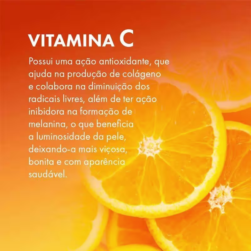 - Vitamina C: Possui uma ação antioxidante, que ajuda na produção de colágeno e colabora na diminuição dos radicais livres, além de ter ação inibidora na formação de melanina, o que beneficia a luminosidade da pele, deixando-a mais viçosa, bonita e com aparência saudável.