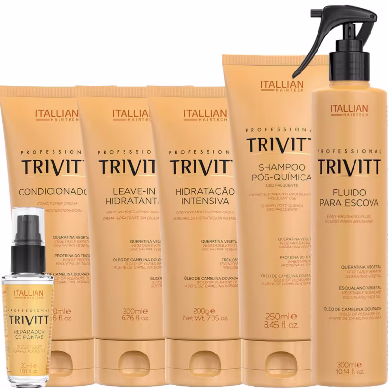 O kit Itallian Trivitt oferece hidratação intensa, maciez e resistência para cabelos quimicamente tratados. Contém shampoo, condicionador e hidratação intensiva com ativos como proteína do trigo, queratina, óleo de camelina dourada e trealose. O modo de uso inclui aplicar o shampoo duas vezes, usar o condicionador do comprimento às pontas e aplicar a hidratação intensiva massageando suavemente mecha por mecha. Pode ser usado com o Fluido para Escova Trivitt antes da escova com secador.