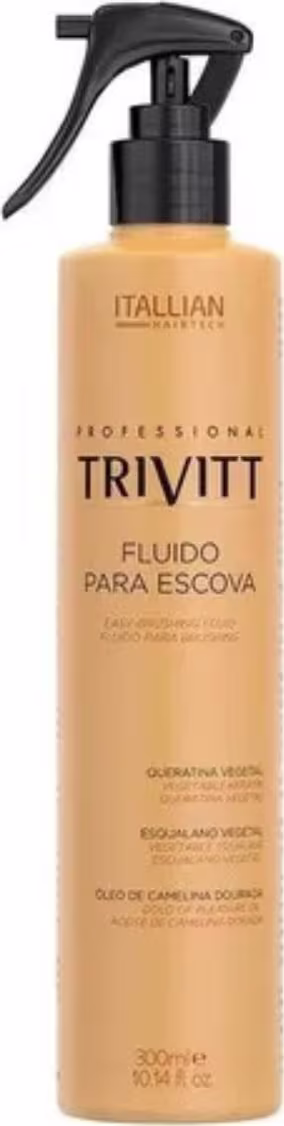 O fluido para escova Trivitt é um produto para cabelos que contém proteção térmica e ajuda a evitar as pontas duplas. Sua fórmula contém filtro solar, queratina, óleo de Camelina Dourada e emulsão de silicone, que juntos restauram as partes danificadas dos fios, reequilibram o teor de água e a distribuição de cargas elétricas da fibra capilar, além de proporcionar brilho intenso e maciez. O produto deve ser vaporizado em pequenas quantidades nos cabelos limpos e úmidos, mantendo a embalagem na posição vertical e a uma distância de aproximadamente 20 cm, antes de proceder à escova com secador.