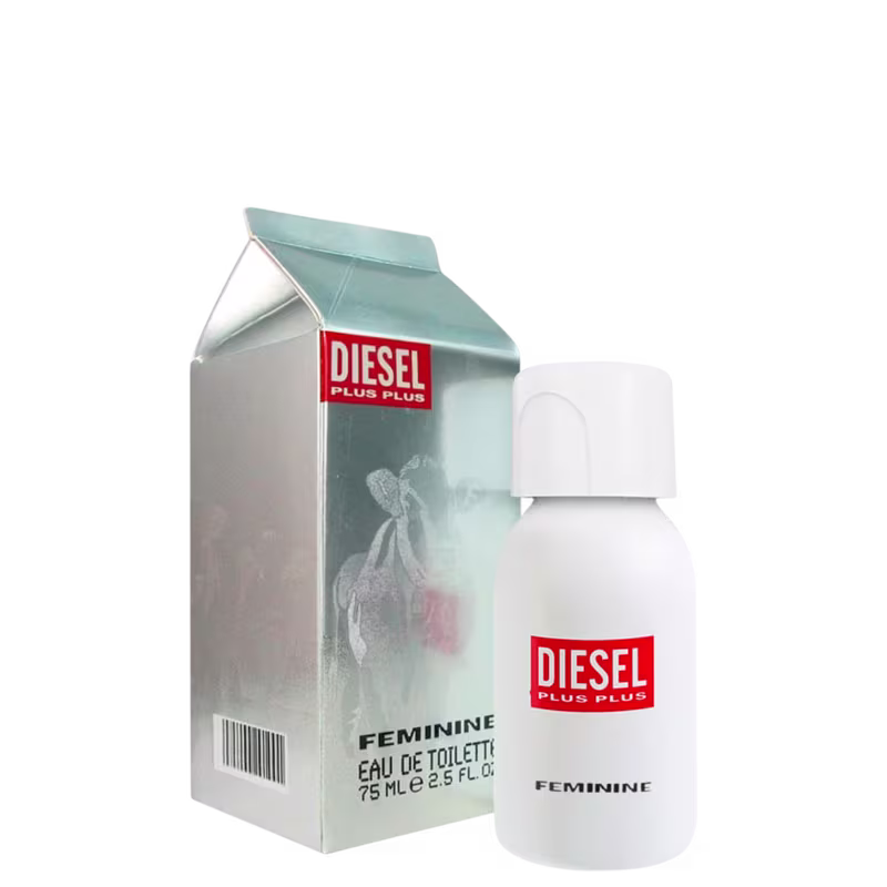 O frasco de Diesel Plus Plus Eau De Toilette - Perfume Feminino é habilmente projetado para retratar uma garrafa de leite, uma homenagem para ilustrar as notas cremosas.