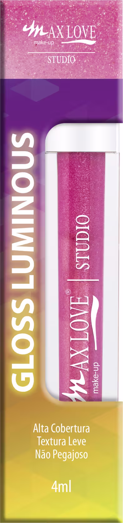 Gloss labial com alta cobertura. O Max Love Gloss Luminous tem cor e partículas brilhantes de glitter para lábios super luminosos.