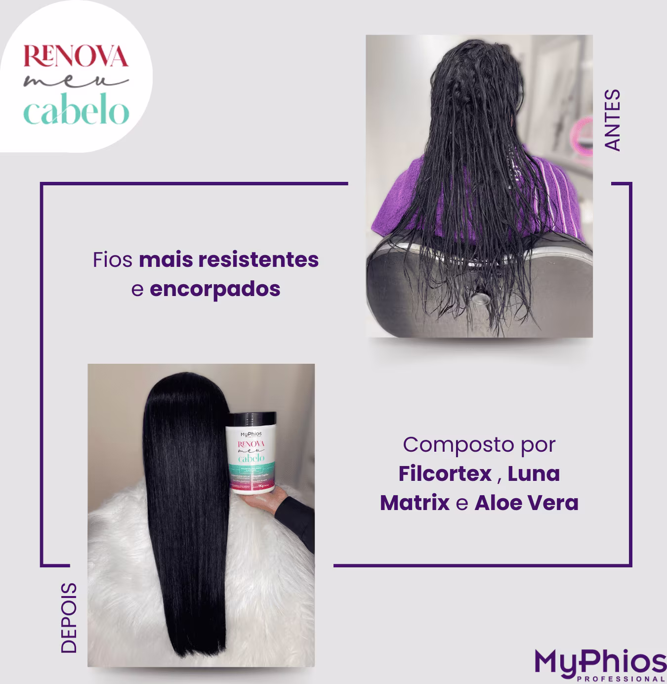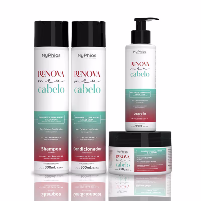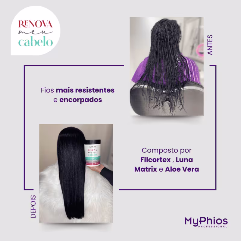 A linha Renova Meu Cabelo da MyPhios Professional é um tratamento completo, intenso e de resultado instantâneo, promove uma recuperação e reconstrução completa da fibra capilar, composto por Filcortex , Luna Matrix e Aloe Vera. Este complexo de micropartículas de proteínas e aminoácidos de baixo peso molecular, possui extrema habilidade de reposição da massa cortical, reparando e reconstituindo toda área fragmentada por uso exagerado de produtos químicos ou pela ação atmosférica e mecânica devolvendo a naturalidade aos cabelos.