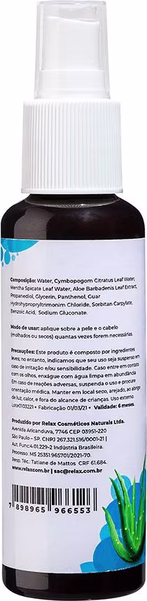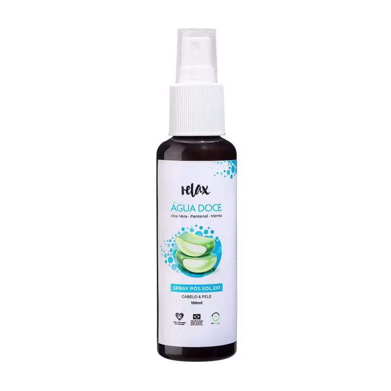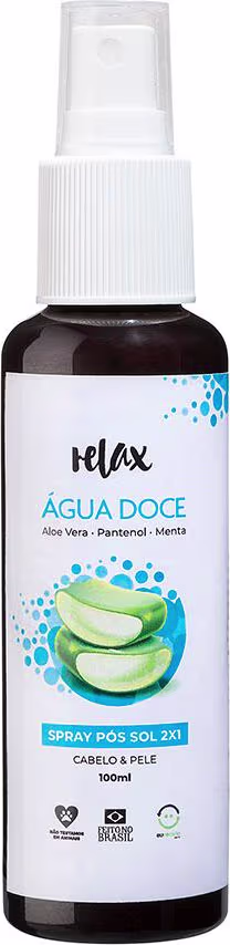 Relax Cosméticos Água Doce é totalmente natural a base de extrato de aloe vera, capim limão e menta refrescando e protegendo seu corpo e cabelo a exposição ao sol, vento, sal e cloro do mar.