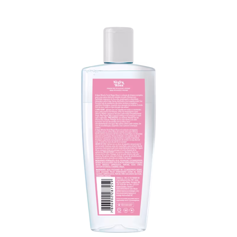 A Água Micelar Facial Negra Rosa é a solução de limpeza completa para a sua rotina diária de cuidados da pele. Elimina com facilidade impurezas do dia-a-dia, maquiagem e oleosidade, deixando a pele limpa, fresca, tonificada e com aspecto mate. Sua fórmula livre de parabenos não deixa resíduos e respeita o equilíbrio fisiológico, trazendo uma sensação de conforto. É muito fácil de usar: todos os tipos de pele vão adorar!