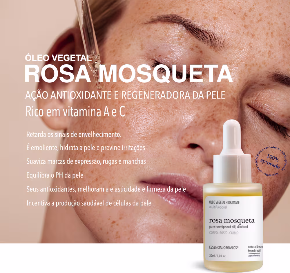 O óleo de rosa mosqueta é rico em vitaminas e nutrientes que deixam a pele hidratada e nutrida. Possui ação antioxidante e regeneradora da pele, por seu alto teor de ácidos graxos. Promove a síntese de colágeno, sendo assim, é indicado para atenuar cicatrizes em geral, estrias, queimaduras, cortes fechados e assaduras. O resultado é uma pele uniforme, com linhas de expressão atenuadas, elasticidade e firmeza natural restauradas. É um aliado no combate das linhas de expressão. Com alto nível de antioxidantes, ele cria uma película na pele, que protege dos danos do cotidiano. Por ser super eficaz na regeneração celular é uma ótima alternativa no tratamento de estrias e cicatrizes.