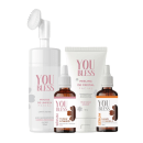 O Kit foi desenvolvido para deixar a sua rotina skincare completa. O Mousse para a limpeza, o Sérum de Ácido Hialrônico para hidratação, sustentação e prevenção de linhas de expressão, o Peeling para renovação da pele e o Sérum de Vitamina C para clarear manchas e incentivar a produção de colágeno natural.
