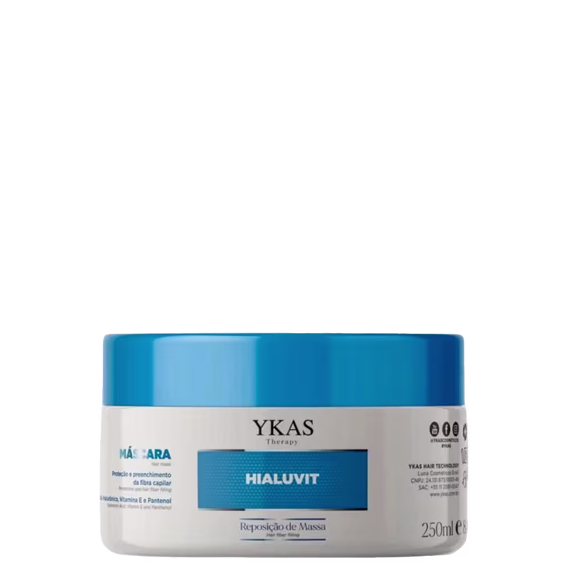 - Ykas Hialuvit Máscara possui em sua formula Ácido Hialurônico que oferece nutrição profunda e duradora desde a primeira aplicação, recupera a superficie danificada da fibra, preenche e suaviza a superficie dos fios que estão porosos, opacos e áspero. Seus cabelos fica mais fortes, ganha flexibilidade, leveza e brilho intenso.