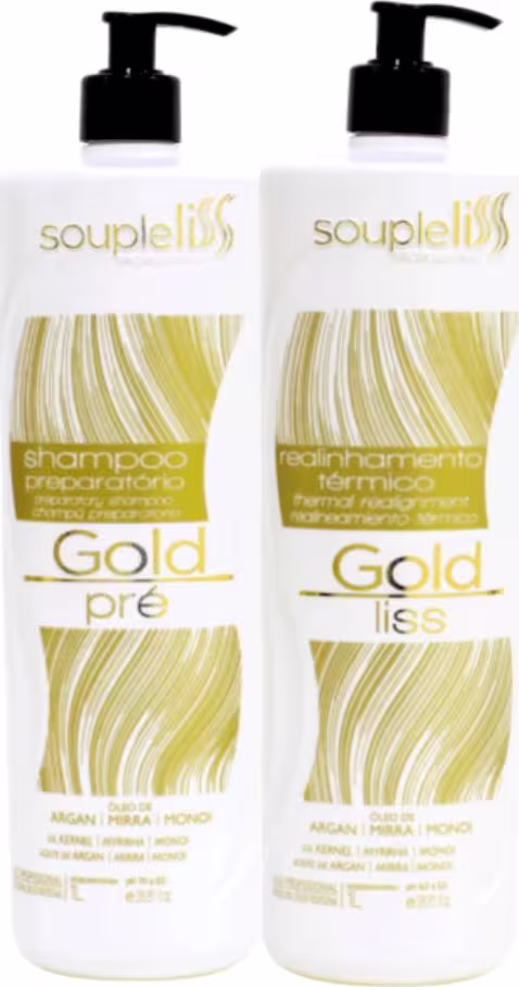Souple Liss Gold: Liso e Reestruturação para os seus cabelos! A Linha Gold Souple Liss traz para você a melhor linha de realinhamento capilar do mercado, pois conta com as gotas de ouro formadas pelo blend de argan, mirra e Monoi, trazendo beleza, reestruturação e muito mais realinhamento para seus cabelos. O Shampoo preparador Gold Souple Liss limpa profundamente e prepara os fios para as transformações fornecidas pelos reconstrutores da linha gold souple liss, fazendo com que o tratamento seja mais duradouro e fortalecedor. O Realinhamento Térmico Gold Liss Souple Liss proporciona aos fios uma potente reestruturação capilar duradoura, e efetiva fornecendo ao fio a reconstrução de sua fibra capilar, gerando cabelos mais bonitos, saudáveis e cheios de vida.