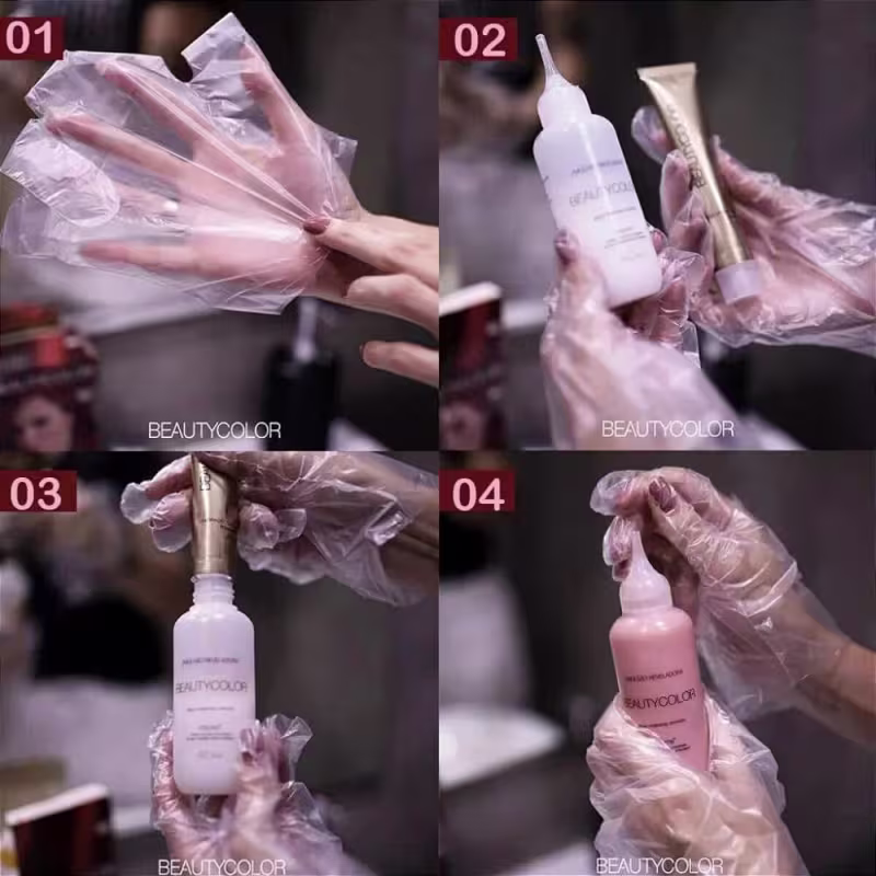 2. Despeje aos poucos o conteúdo da bisnaga da coloração creme beautycolor dentro do frasco aplicador da emulsão reveladora e agite alternadamente até obter uma mistura cremosa e homogênea.