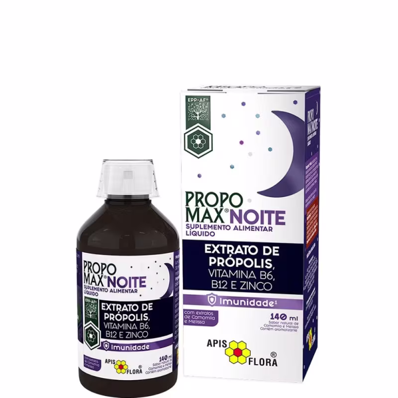 Propomax Noite, produzido com o exclusivo extrato de própolis EPP-AF, também traz em sua composição ¹zinco, vitaminas B6 e B12, que auxiliam no funcionamento do sistema imune, além dos extratos de camomila e melissa.