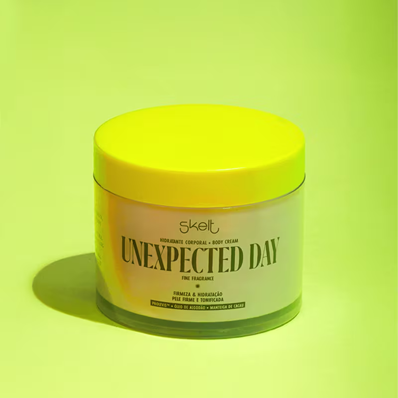 Skelt Unexpected Day - Hidratante Corporal 200g: traz na fórmula o Prolevis, que causa um efeito tensor, dá resistência e delicadeza logo na primeira aplicação. Além disso, também possui Óleo de Algodão e Manteiga de Cacau que conferem ação antioxidante, amenizam os processos inflamatórios, deixam a derme macia e combatem os radicais livres.