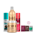 Todos os produtos são de uso profissional e, quando usados em conjunto, oferecem limpeza, nutrição, reconstrução e finalização aos cabelos secos e danificados.
