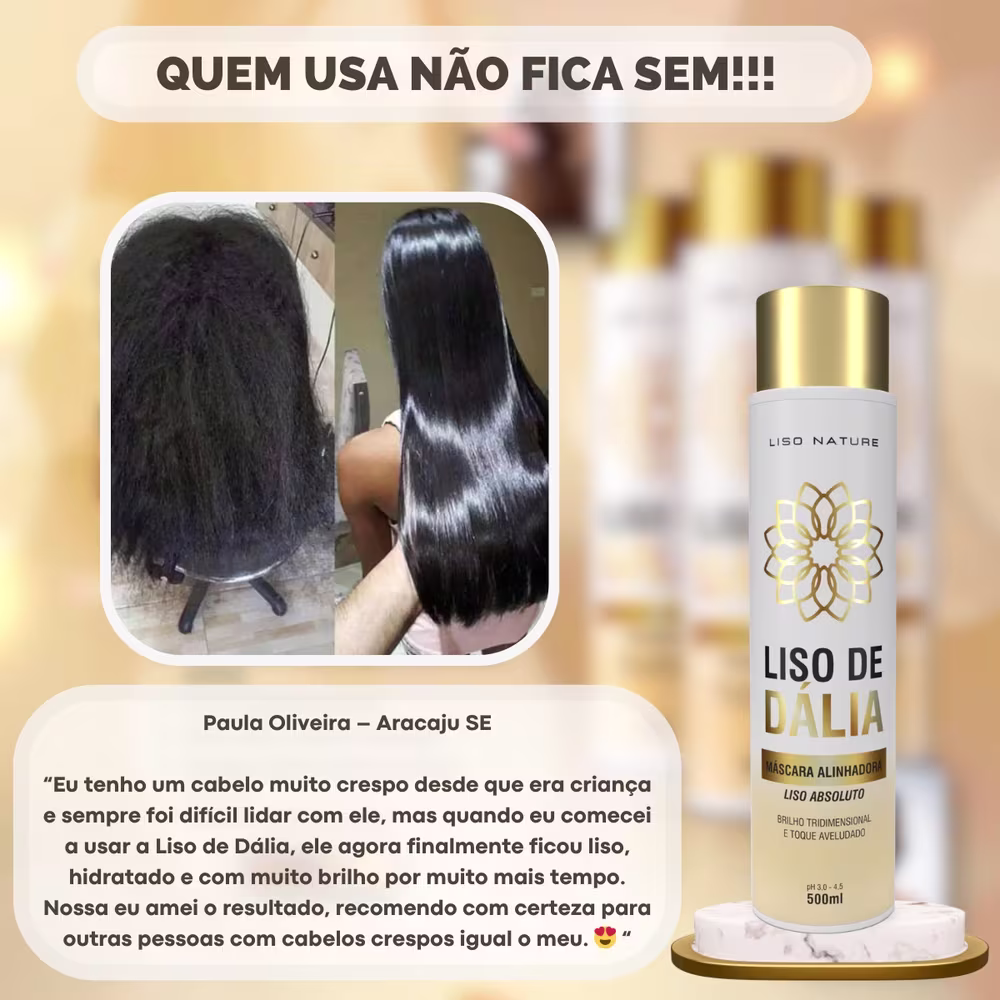 A Liso de Dália é a solução para quem busca cabelos lisos e sedosos, desenvolvida com a a tecnologia de ponta e ingredientes de alta qualidade, oferecendo resultados duradouros, mantendo o cabelo liso e sedosos por meses. Escolher a Progressiva Liso de Dália é para quem busca uma progressiva que vai além do comum. Seus cabelos nunca mais serão os mesmos, e você vai se perguntar como viveu tanto tempo sem essa maravilha em um frasco. Prepare-se para ser persuadida pela beleza deslumbrante de seus próprios cabelos com resultados que vão além do esperado!