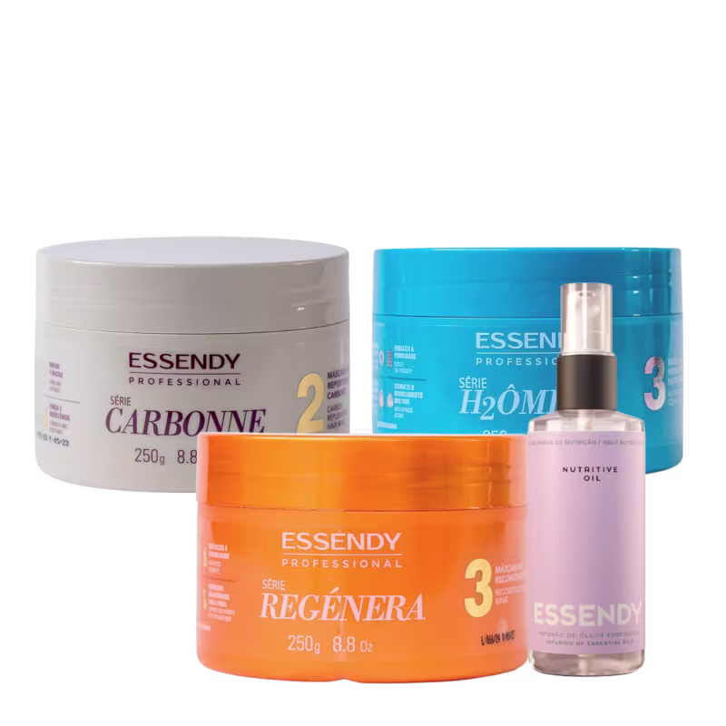 O Kit para Cronograma Capilar Essendy possui três incríveis tratamentos! Série H2ômega, Série Carbonne e Série Regénera, que auxiliam na hidratação, nutrição com reposição de carbono e reconstrução respectivamente.