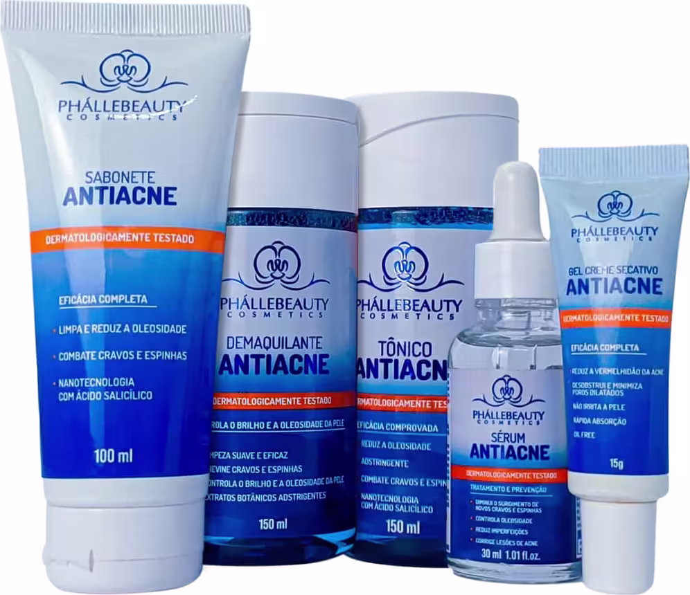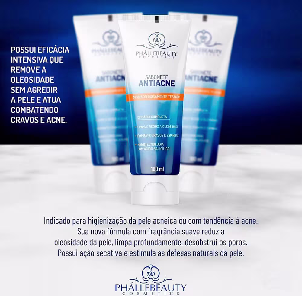 A linha Antiacne da Phállebeauty foi criada para ajudar na limpeza e redução de oleosidade, e combater cravos e espinhas. Seu uso reduz a acne, marcas de acne e poros visíveis na pele, com efeito “peeling”.