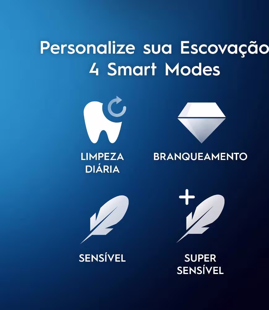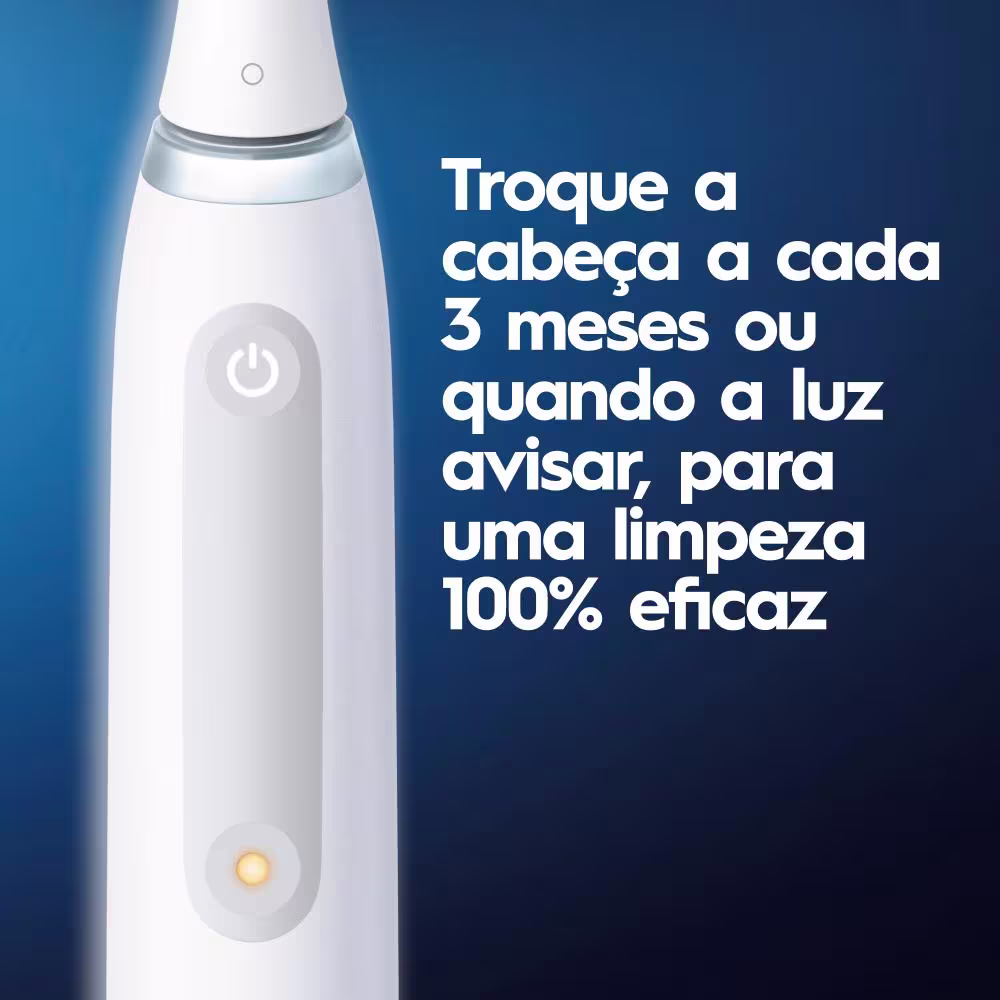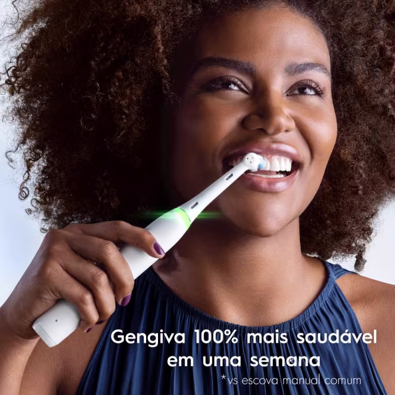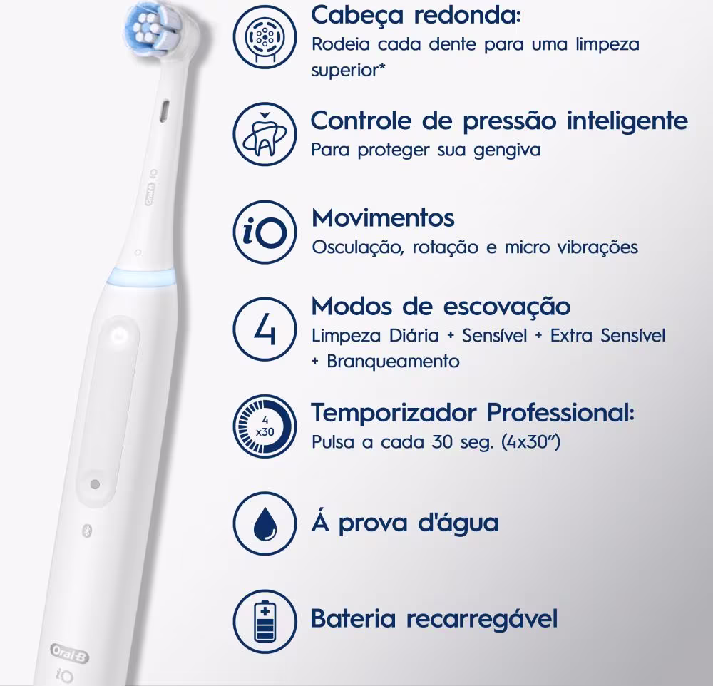 A melhor limpeza da Oral-B com a revolucionária tecnologia magnética iO: clinicamente comprovada, 100% dentes mais saudáveis em 1 semana, comparado com escova manual. O i04 te guia para uma limpeza perfeita. Com treinamento personalizado em tempo real. O aplicativo que o acompanha mostra seu relatório diário de escovação. Com 4 modos de escovação, a Oral-B está ao seu lado para suas tarefas diárias de escovação. Com sua cabeça redonda e microvibrações, gera um movimento suave e harmônico através de uma ação de limpeza sincronizada (microvibrações sincronizadas com oscilações). Um temporizador de 2 minutos incorporado garante uma experiência ainda mais fácil, ajudando você a obter uma limpeza ótima em todos os seus dentes. O temporizador de quadrante da Oral-B divide os dois minutos em quatro intervalos de 30 segundos para limpar cada quadrante da boca; nós contamos o tempo para você, então você não precisa fazê-lo. O sensor de pressão indica a pressão de limpeza ideal e avisa sobre pressão excessiva. Com uma capa de viagem incluída, você terá uma limpeza fresca onde quer que vá. Estamos com você em sua próxima viagem ou mesmo em sua escovação de tarde em movimento! O melhor de tudo é que a Oral-B traz para você, a marca número 1 recomendada por dentistas em todo o mundo*.