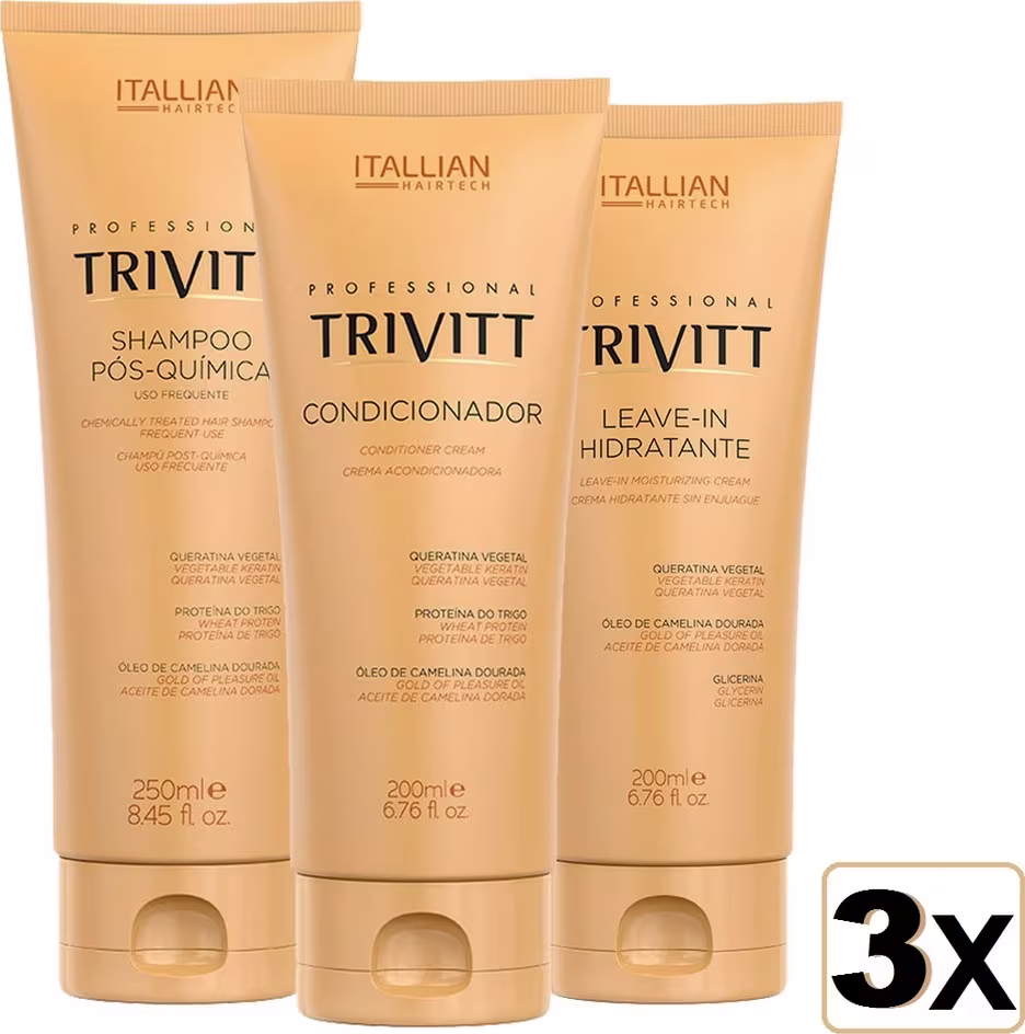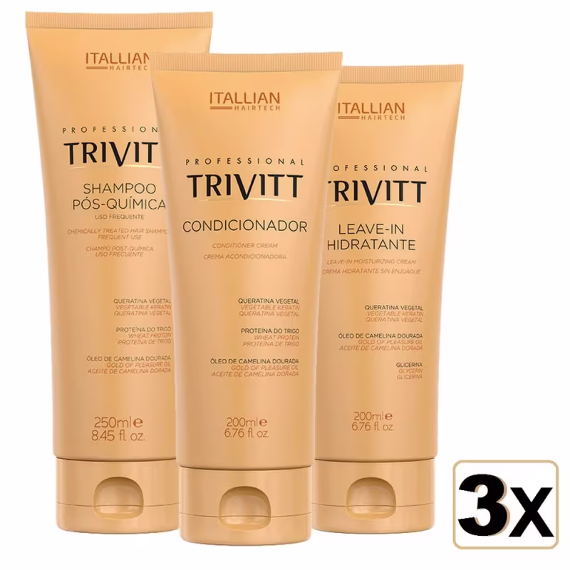 Itallian Trivitt Kit Home Care com Hidratação Intensiva oferece hidratação intensa, maciez e resistência ao cabelo quimicamente tratado. Leva ingredientes que reparam a estrutura dos fios danificados, protegem do frizz, do ressecamento e das pontas duplas para um cabelo mais resistente à quebra.
