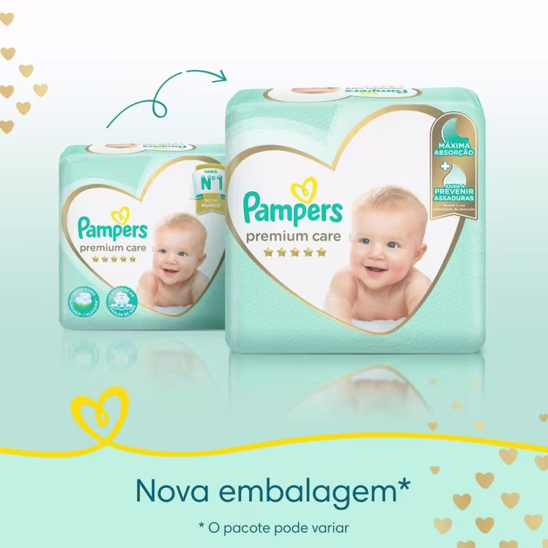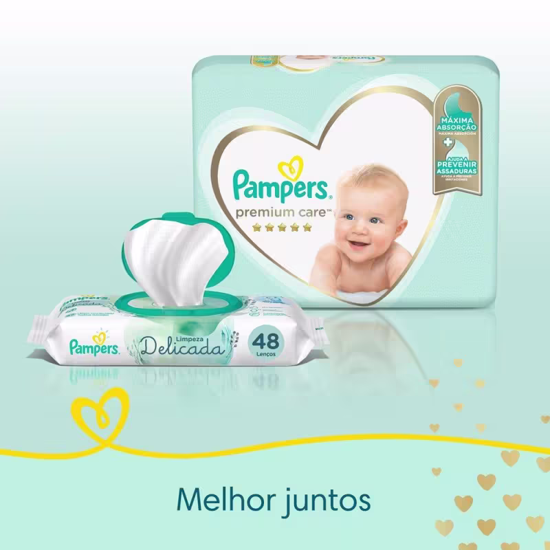 Pampers Premium Care , nossa proteção mais suave para a sua pele. É suave como o algodão° e ultra respirável. Também tem canais de ar para uma pele seca e arejada, e uma loção hipoalergênica exclusiva que ajuda a prevenir irritações.
