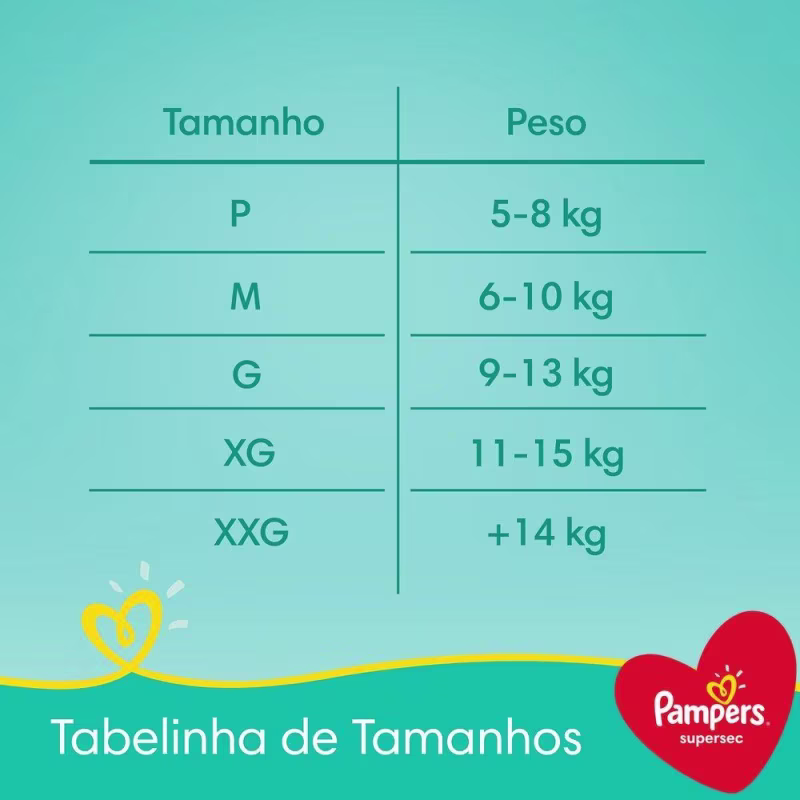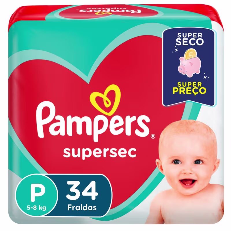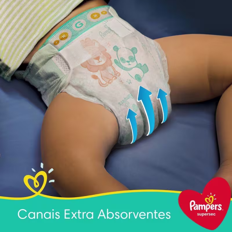 1 Pampers Supersec mantém seu bebê mais seco do que outras fraldas* por 1 noite inteira, porque somente Pampers Supersec tem canais extra-absorventes exclusivos, que distribuem o xixi uniformemente e impedem que ele entre em contato com a pele do seu bebê. Então, você muda menos e economiza mais.