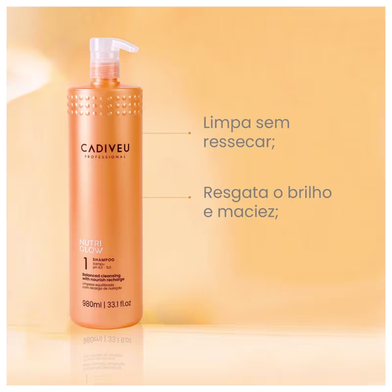 Cadiveu Professional Nutri Glow - Shampoo Sem Sulfato 980ml (2 unidades): oferece uma solução profissional instantânea para cabelos ressecados e sem vida. Um tratamento completo para fornecer a reposição lipídica que esses fios mais secos necessitam, alinhando as cutículas para trazer de volta o brilho, movimento, sedosidade e vitalidade.