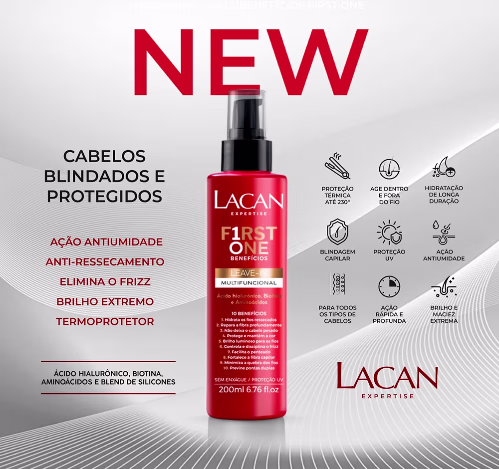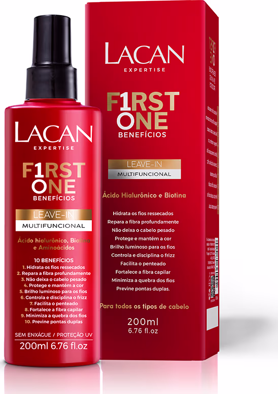 Distribua o produto uniformemente na palma da mão, em torno de 5 pumps e friccione. No cabelo seco ou úmido, aplicar em toda a extensão dos fios, massageando os cabelos e deslizando os dedos entre os fios. Pode ser usado também antes de procedimentos térmicos (escova/prancha/chapinha) e finalizar como de costume. Não é necessário enxaguar. A quantidade de produto poderá variar para mais ou menos de acordo com o tipo de cabelo. Para resultados ainda mais surpreendentes sugerimos o uso dos demais produtos da linha FIRST ONE LACAN.