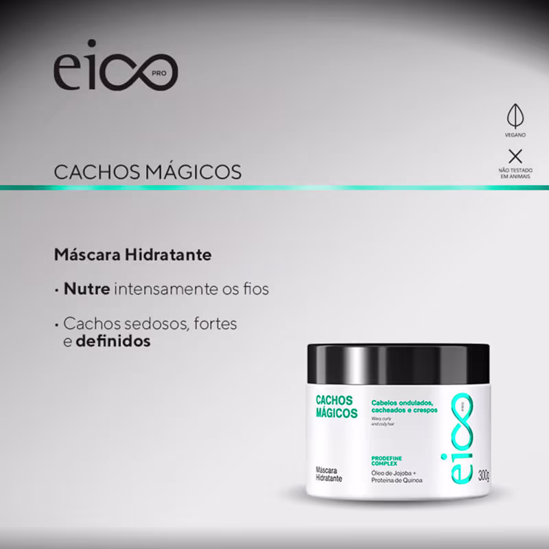 A Máscara Hidratante Eico Pro Cachos Mágicos foi desenvolvida para nutrir e definir cabelos cacheados e ondulados, proporcionando hidratação intensa, controle do frizz e mais elasticidade aos fios. Com uma fórmula enriquecida com ativos poderosos, ela mantém a saúde dos cachos, deixando-os macios, brilhantes e cheios de vida.