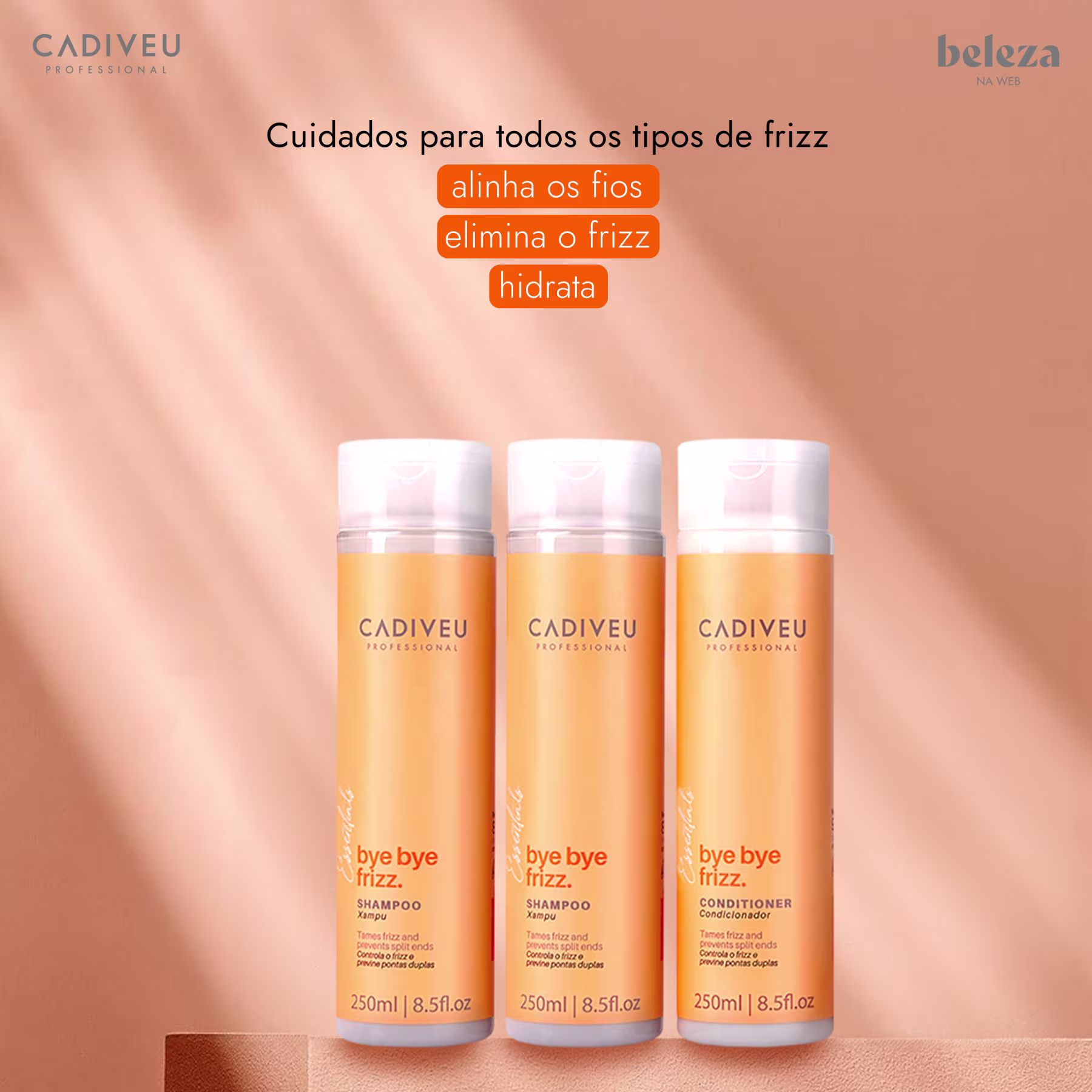 Cadiveu Professional Essentials Bye Bye Frizz - Shampoo 250ml (2 produtos): Para todos os tipos de cabelo. limpa sem ressecar, alinha os fios e restaura o brilho.retira as impurezas, mantendo o cabelo limpo e preservado. A formulação, elaborada com Óleo de Camélia e Ômegas 3, 6 e 9, cria o efeito de cabelo perfeito, livre de frizz, brilhante e com aparência saudável.