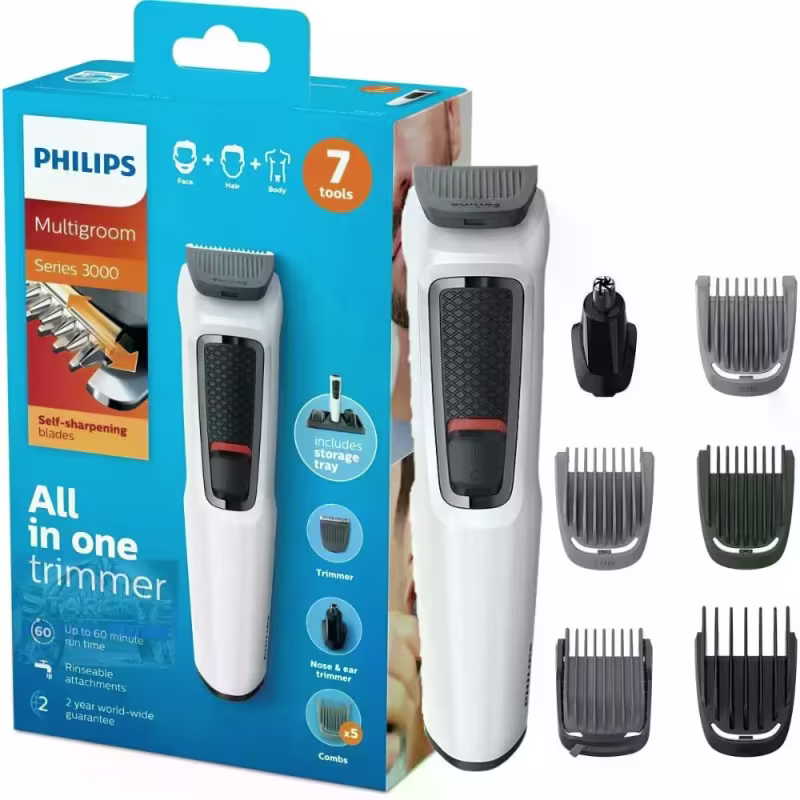 O aparador multifuncional Philips Multigroom 3000 vem com 7 acessórios projetados para modelar seus pelos faciais e cortar o cabelo de forma conveniente.