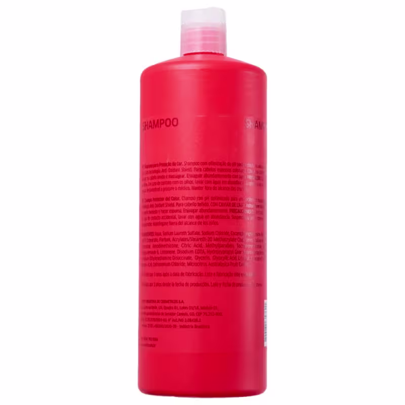 Sobre o Produto: Shampoo indicado para cabelos coloridos ou com mechas. realiza uma limpeza suave, blindando a cor do desbotamento. Fórmula profissional enriquecida com Oxidantes protege do desbotamento. preserva a cor vibrante por até 7 semanas.