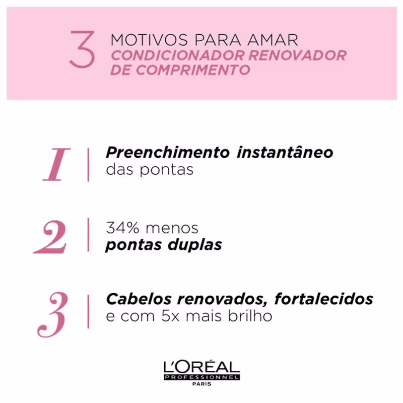 Condicionador indicado para cabelos longos. Possui uma fórmula profissional enriquecida com Filler-A100 e amino Acid, que proporciona preenchimento instantâneo das pontas, ajuda na renovação da fibra capilar, garante um cabelo sedoso, hidratado e com maleabilidade.