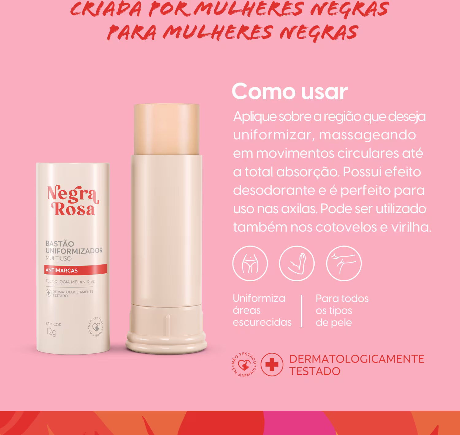 O Bastão Uniformizador Multiuso Negra Rosa foi especialmente desenvolvido para as áreas escurecidas das axilas, cotovelos e virilha. Possui tecnologia Melanix-3D, um complexo ativo com tripla ação: auxilia na redução de marcas pigmentares e áreas escurecidas, uniformiza o tom da pele sem efeito clareador e ajuda a prevenir o aparecimento de novas marcas. Os resultados são perceptíveis após o uso contínuo durante 30 dias. E tem mais: possui efeito desodorante, textura leve e não deixa resquícios de cor na pele. EFICÁCIA