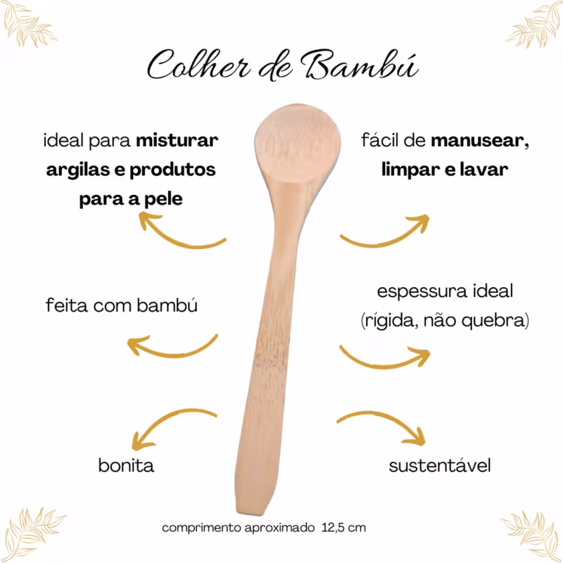 MODO DE USO: Utilize a colher para dosar pós, argilas ou misturar blends em recipientes. Após o uso, lave com água e sabão neutro e seque naturalmente. A madeira de bambú é higiênica e muito mais sustentável que colheres plásticas.