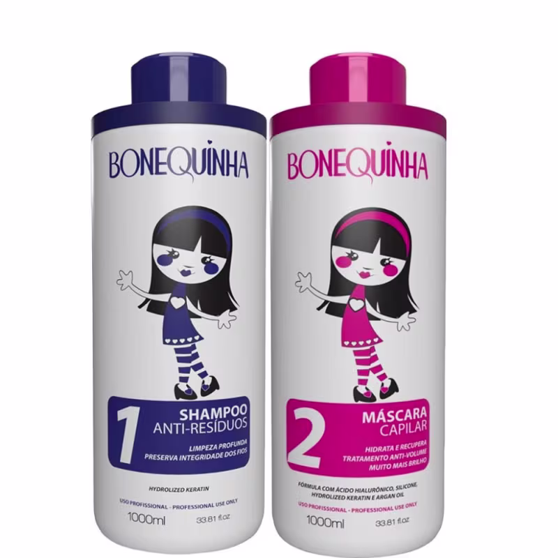 Bonequinha Escandalosa Tratamento Tradicional 2x1 Litro O Shampoo Anti-Resíduos Bonequinha foi especialmente elaborado com um complexo hidratante de extratos e óleos vegetais para uma limpeza profunda sem danificar os fios, permitindo a abertura das escamas e retirando resíduos, poluição que vão se depositando nas camadas das cutículas dos cabelos, tornando-os pesados, sem brilho, sem vida e retirando a ação de nutrientes ativos. Age na higienização dos fios sem comprometer a sua estrutura. Devido ao seu pH equilibrado, tem o poder de abrir as cutículas capilares preparando os fios e deixando-os prontos para o tratamento. A Máscara Capilar Bonequinha, foi desenvolvida com um blend hidratante a base de ácido hialurônico, silicone, hydrolyzed keratin e argan oil, que promovem a redução e a hidratação nos fios quebradiços, causados por outros processos químicos. Em uma única etapa reduz o frizz e repõe a queratina dos fios, proporcionando brilho e maciez, devolvendo o aspecto natural dos cabelos.