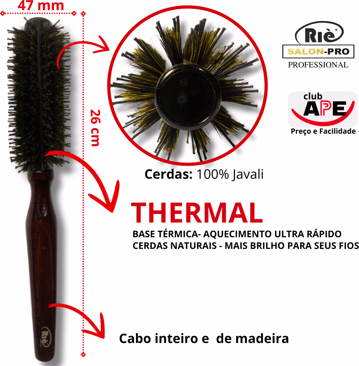 A Escova RIÈ salon-pro Premium Wood dá um brilho incrível aos fios. As cerdas naturais permitem a liberação de micropartículas de óleos que distribuídos, deixam os cabelos muito mais saudáveis, macios e com brilho. Sua base térmica ajuda a acelerar o processo de secagem, além de proteger os fios.