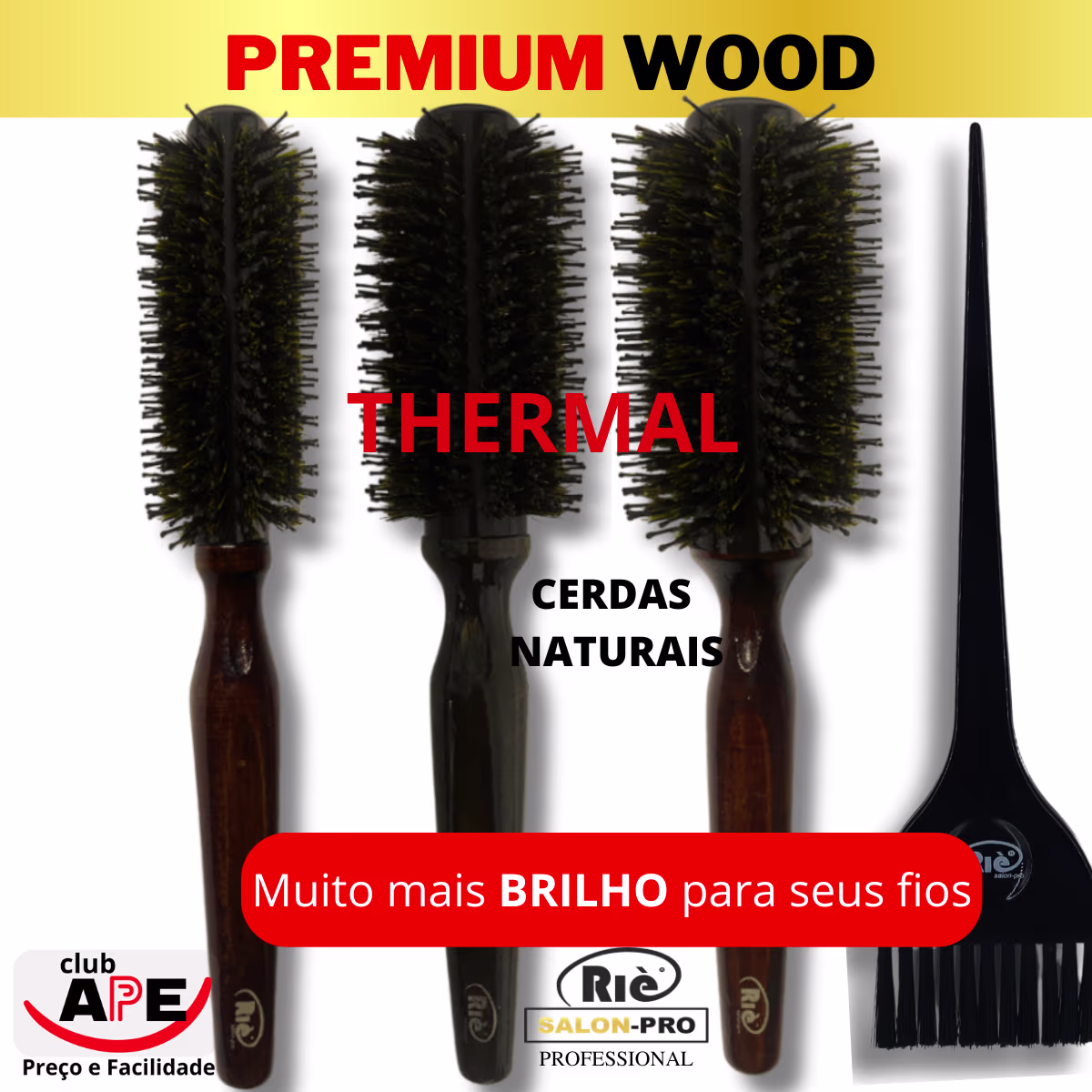 KIT COMPOSTO POR: 01 Escova Premium Wood 47 mm / 01 Escova Premium Wood 57 mm /01 Escova Premium Wood 64 mm/ 01 Pincel para Aplicação de Tintura Ultra-Largo MARCA: RIÈ salon-pro DIÂMETRO: 64 MM CERDAS: 100% Javali CABO: Madeira - Inteiriço BASE: Thermal Metallic Escova de cabelo RIÈ salon-pro Premium Wood permite um processo de secagem ou modelagem muito mais rápido e com proteção aos fios.