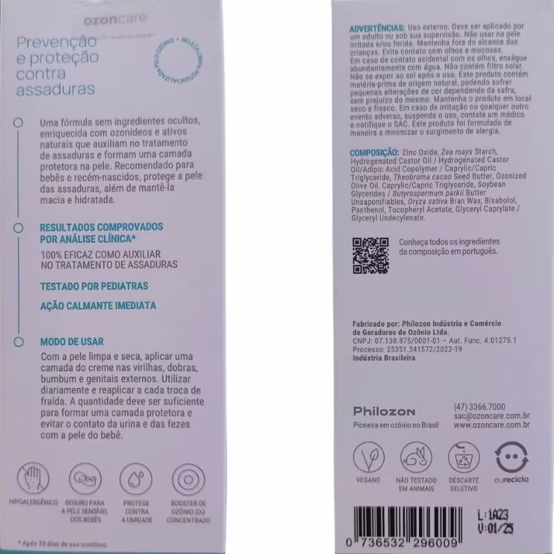 O Creme Ozonizado para Assaduras é um produto que atua na prevenção e alívio de assaduras e irritações na região da fralda, que podem ser causadas pelo contato direto da pele com fezes e urina. Com propriedades calmantes e que favorecem a cicatrização, é indicado para a pele delicada de bebês e recém-nascidos.