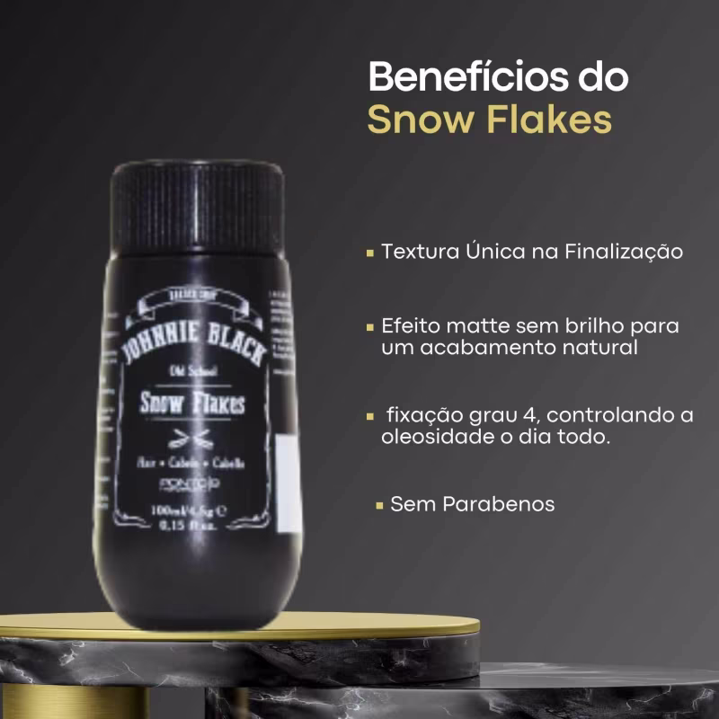 Johnnie Black Snow Flakes 4,5gr garante volume e fixação forte, sem deixar brilho, combatendo a oleosidade.
