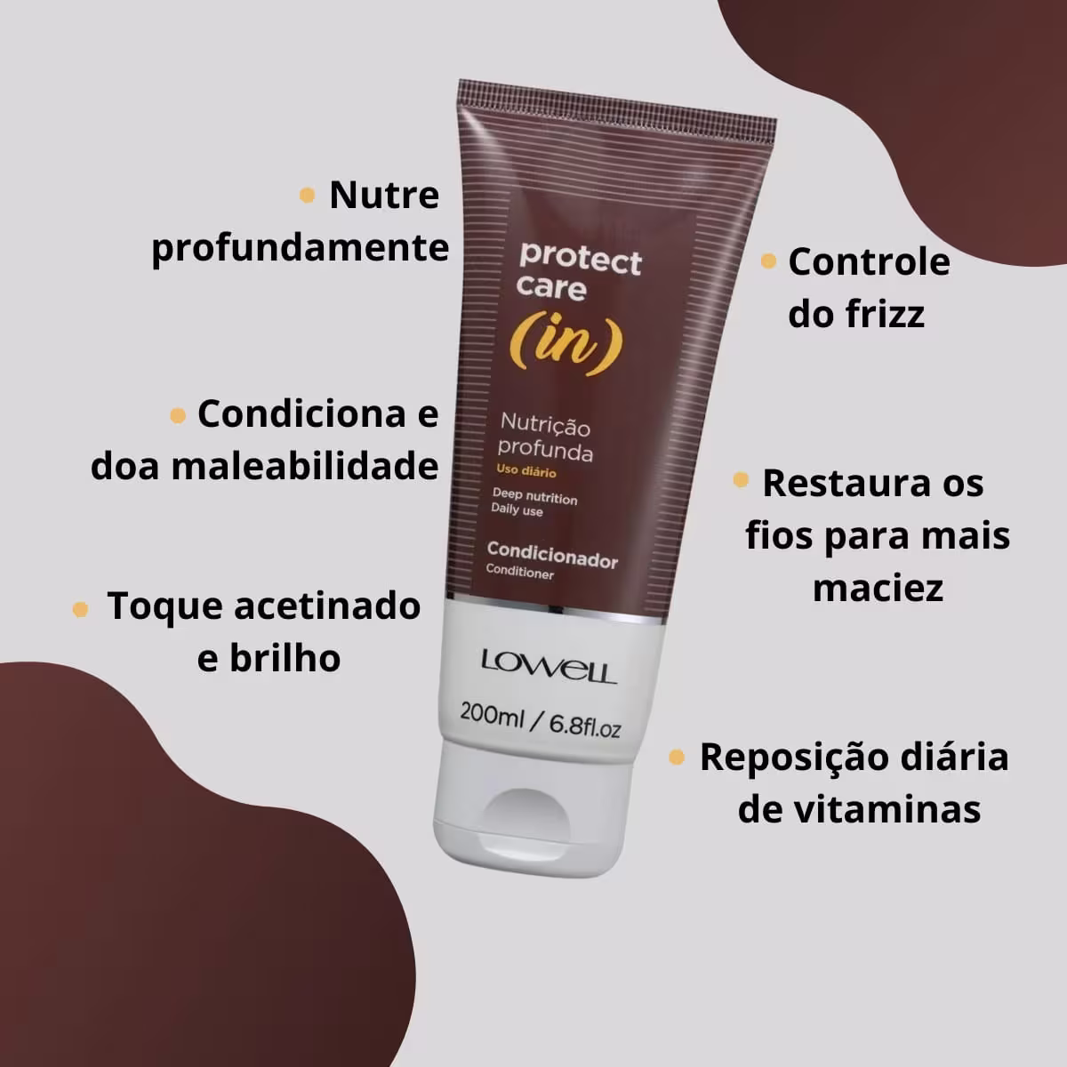 - Condicionador Lowell Protect Care In: oferece a reposição diária de vitaminas essenciais que nutrem, condicionam e restauram a maciez.