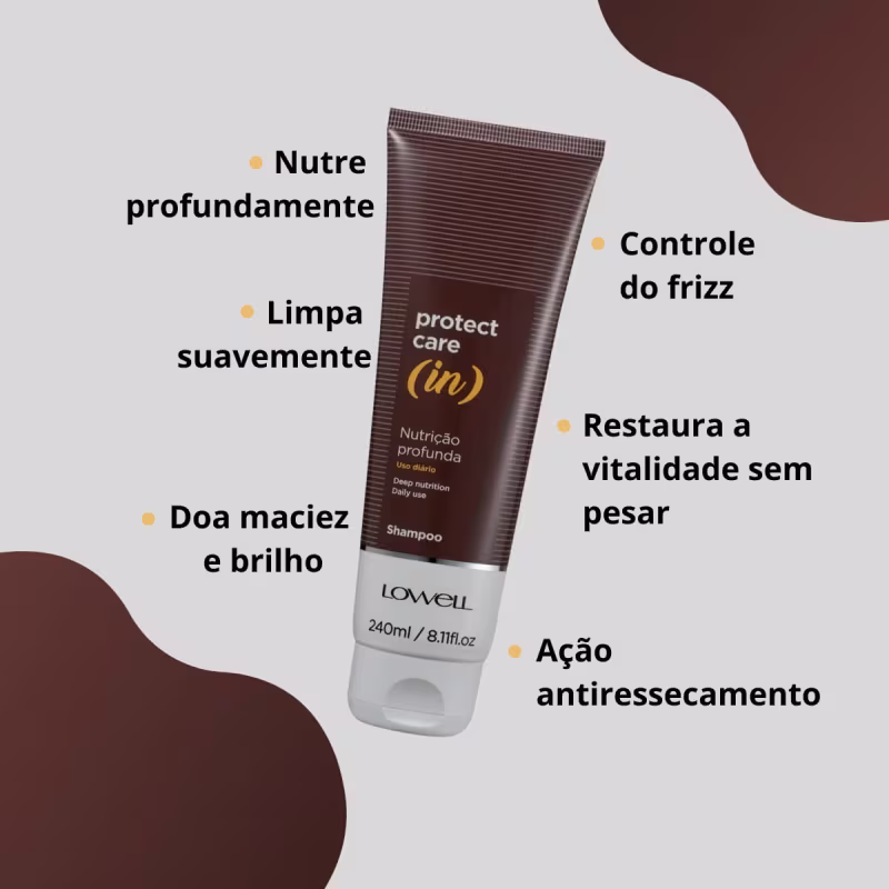 - Shampoo Lowell Protect Care In: permite limpeza suave e eficaz além de ação antiressecamento. Restaura a vitalidade sem pesar os fios impedindo a perda de nutrientes essenciais para um cabelo saudável.