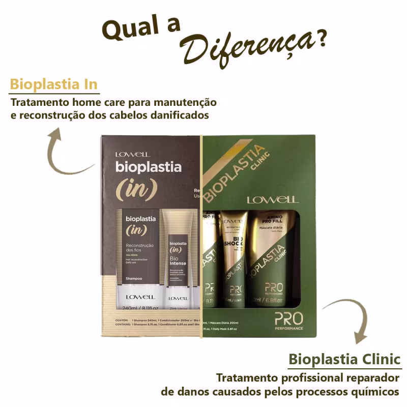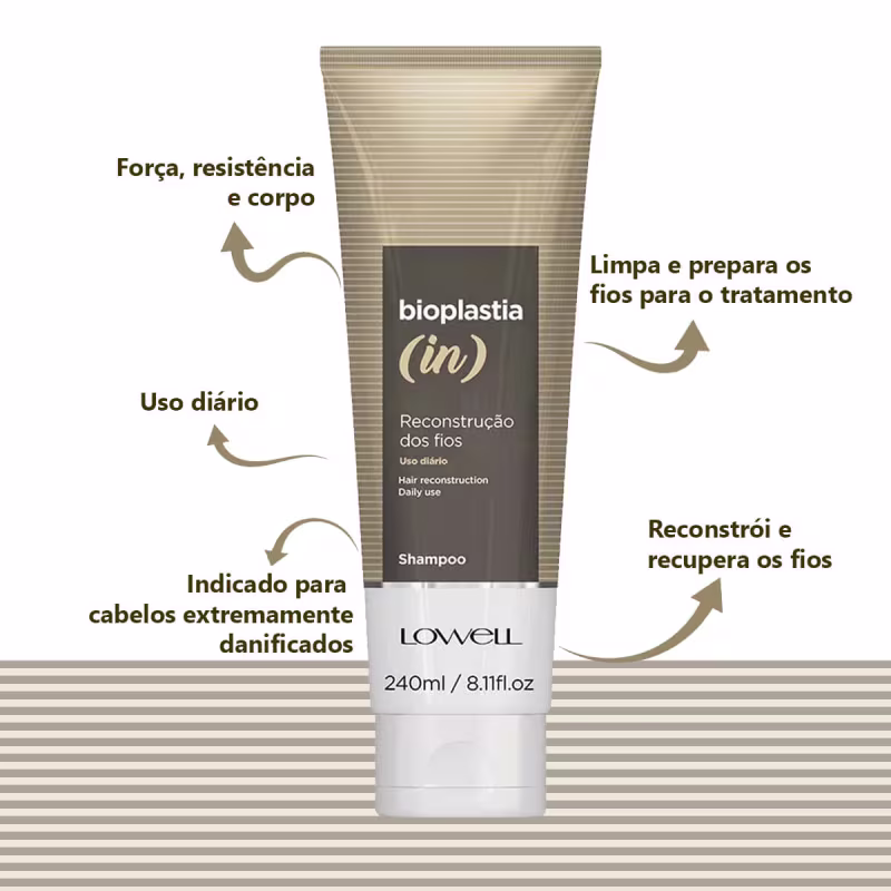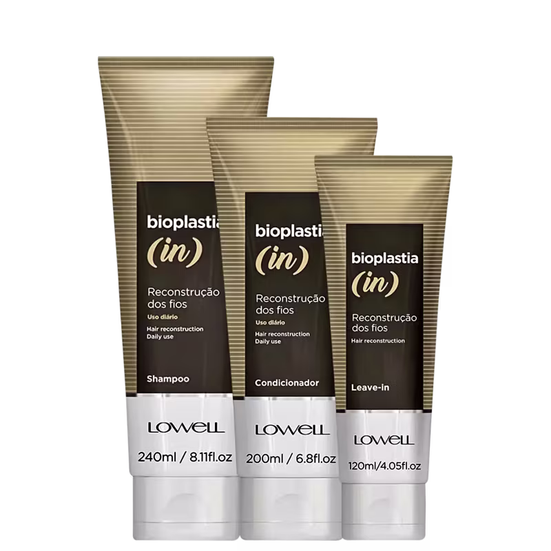 - Shampoo Lowell Bioplastia In: limpa, hidrata e recupera a fibra capilar, oferecendo limpeza efetiva, força e suavidade enquanto prepara os fios para receber o tratamento.