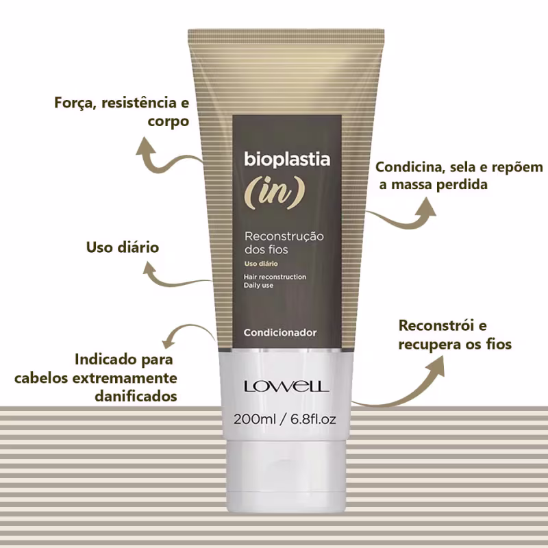 - Condicionador Lowell Bioplastia In: sela e repõem a massa perdida dos fios para mais maciez, força e suavidade.
