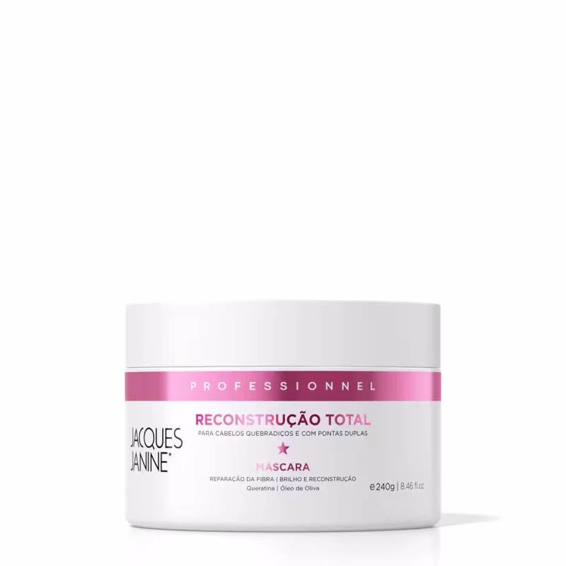 Jacques Janine Professionnel Reconstrução Total – Máscara 240g: reparação intensa dos cabelos danificados, quebradiços e com pontas duplas. Com a Continuidade, ocorre a reposição de proteínas nos fios frágeis e sensibilizados, deixando os cabelos fortes e com vitabilidade. Além de desembaraçar e hidratar, promove a reparação e reconstrução das fibras capilares, protegendo os cabelos contra as quebras e novas agressões.